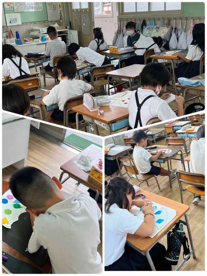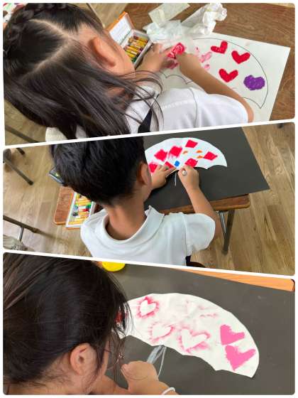 大きなかさを作って、その中や外に、いろいろな模様を描きました。そこで、型を作って、その中に色を塗ったり、かさの外側に雨のしずくやアジサイなどの絵を描いたりと、いろいろな工夫をしながら頑張っていました。