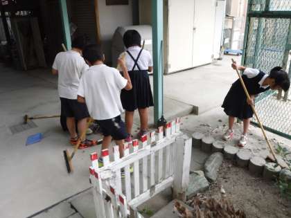 毎日きれいにしても、毎日土埃や枯れ葉がやってきます。「不思議だねえ。」と話しながら、一生懸命に力を合わせて頑張っています。