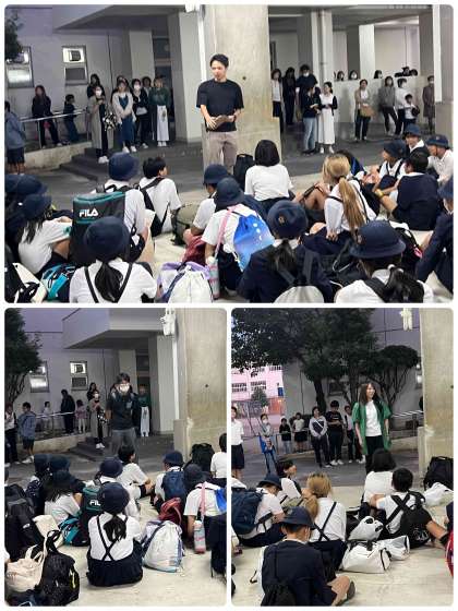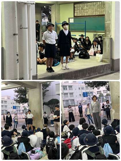 ピロティーで帰校式を行い、修学旅行が無事終了しました。