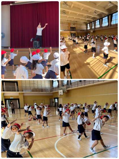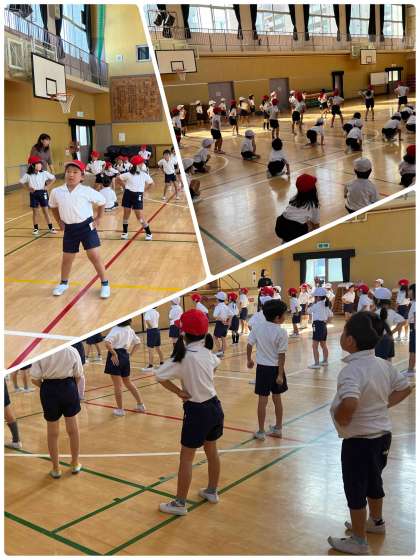 運動会の練習している1年生。今日は、講堂でダンスの練習を頑張っていました。
