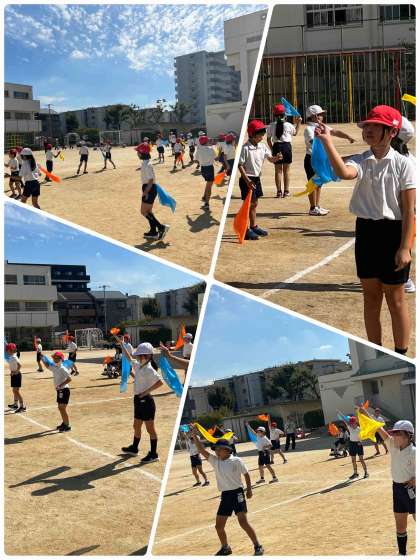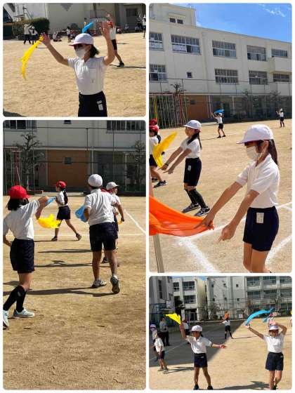 カラフルなスカーフを付けて、リズムに乗りながら全身で踊るのが3年生の団体演技の特徴です。途中に移動が何度もあり、また複雑な隊形もありますが、周りに合わせながらきれいに並んで踊っているのは、さすが3年生です。