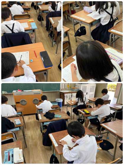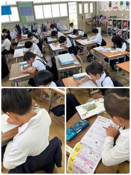 漢字の勉強をしている1年生。今日は、漢字テストが行われました。