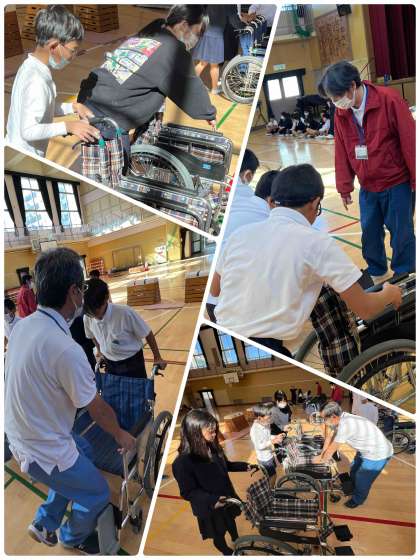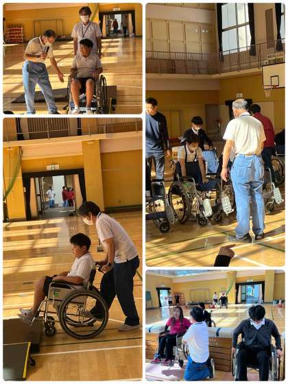 そして、講堂を出て、友だちを乗せて校舎内を回りながら介助体験をしました。