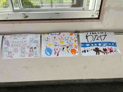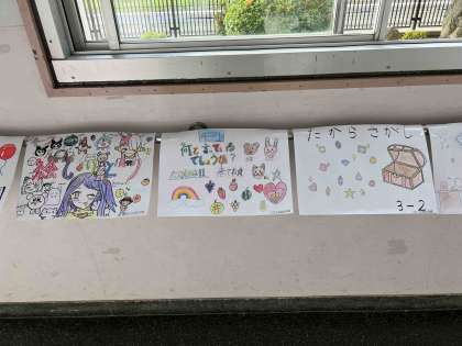 水曜日に行われる喜連西フェスティバルに出店する、各学級のお店のポスターが職員室前に掲示されています。