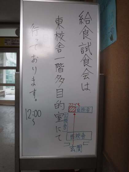 12:00〜多目的室(東校舎1階)で行います。事前にお申込みになった方々と、子ども達が食べている給食を食べて、栄養教諭の吉田先生からお話をしていただきます。