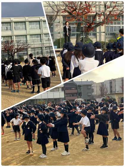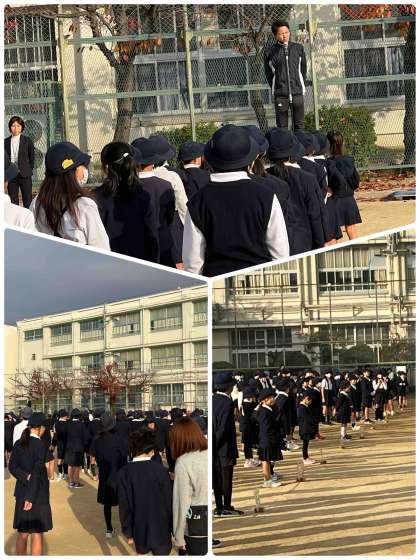 暖かい日差しでとても過ごしやすい朝、運動場で児童朝会がありました。