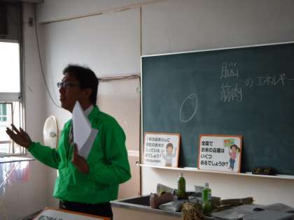 教室をのぞいた時には、エネルギーについてお話されていました。脳のエネルギー源は炭水化物で、1日に摂取するうちの20%も使ってしまうそうです。(残り70%は筋肉で、10%はその他の臓器で消費するとのことです。)
