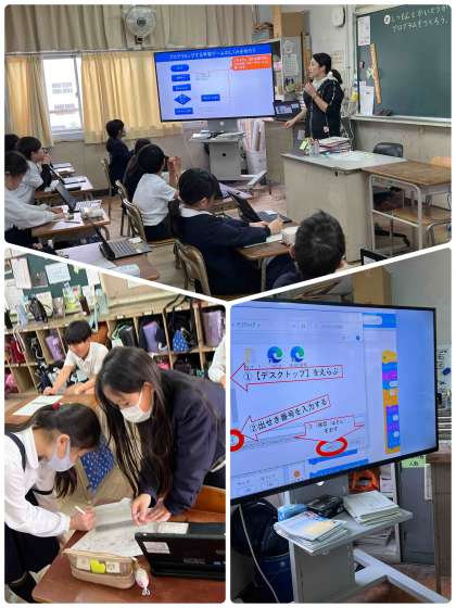 3年生は、1台端末を使ってプログラミングの学習をしています。SCRATCHというアプリを使って、キャラクターに色々な指示を与えています。