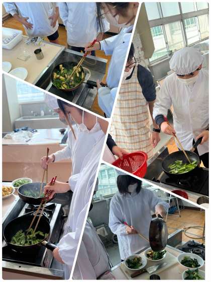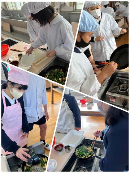 6年生は、調理実習で「青菜と油あげのいためもの」を作りました。