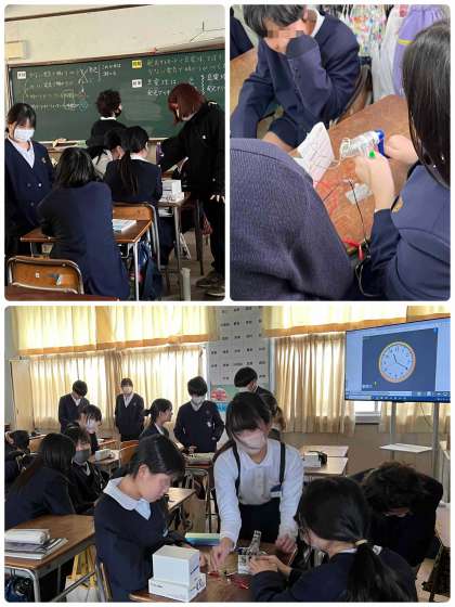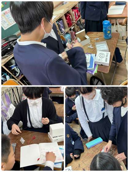 手回し発電機を使って蓄電し、光の色や光る時間について注目して考えました。