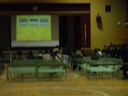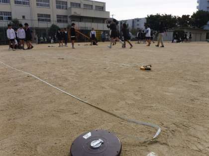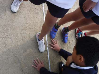 6年生は講堂での活動、5年生は運動場で算数科の「平均」の学習をしていました。