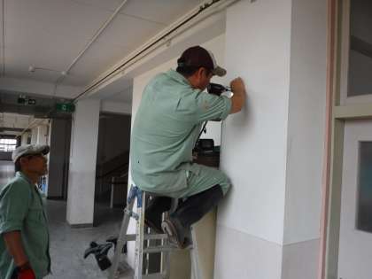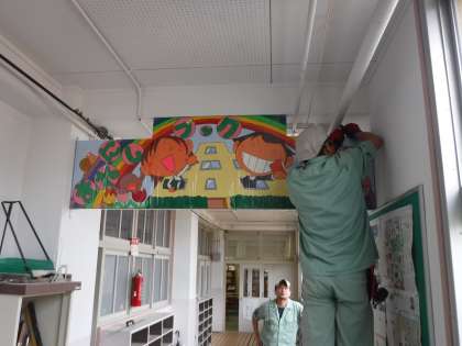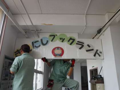 図書室の前に設置してくださったのは、管理作業員さんお2人です。