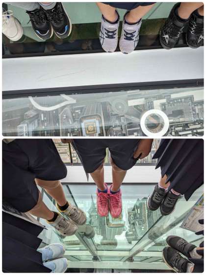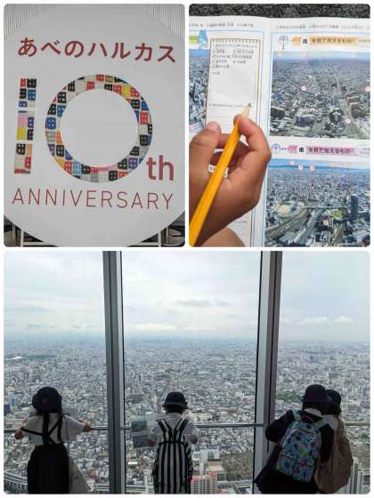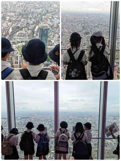 展望フロアから、大阪の町を一望でき、子どもたちは興味をもって観察していました。天気は少し悪かったですが、京セラドームや生駒山なども見え、子どもたちも喜んでいました。