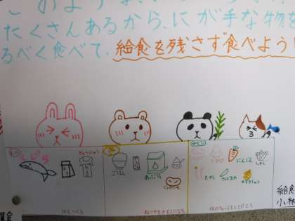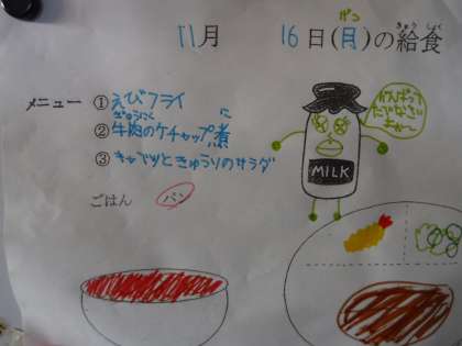 今日の献立を給食委員がかわいくわかりやすくかいてくれていました。