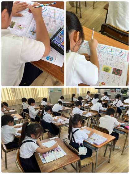 カタカナの学習を頑張っている1年生。今日は、「ケ」「コ」について勉強しました。