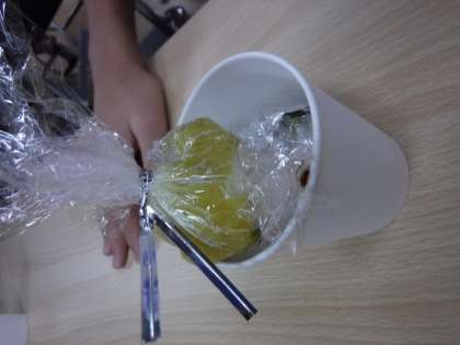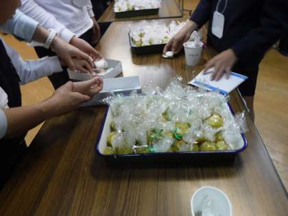3時間目に、つくったスイートポテトと大学芋を包んで、多目的室に移動させました。