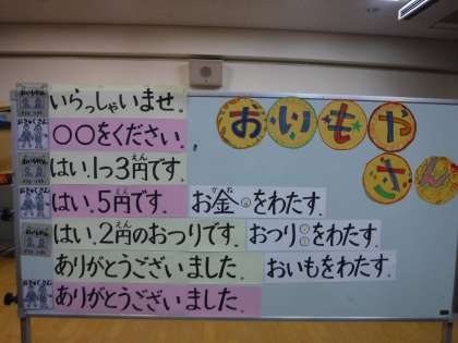 4時間目たくさんの保護者の方々も一緒に、お店屋さんとお客さんになって、1つ3円のおイモとお金のやり取りを楽しみました。