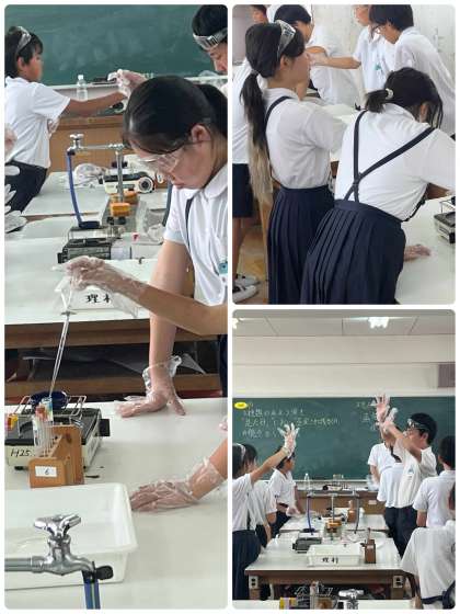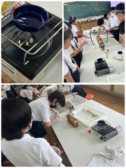 の水溶液を試験管に入れ、見た目やにおい、蒸発させて残るもの、の3つの観点で調べました。安全に実験を頑張っている様子が、さすが6年生でした。