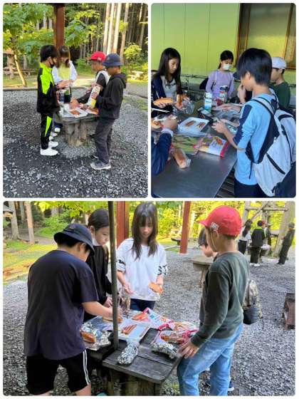 牛乳パック等に、材料を入れて焼きます。グループで協力しながら、楽しく活動していました。出来上がったカートンドッグは、おいしくいただきました。