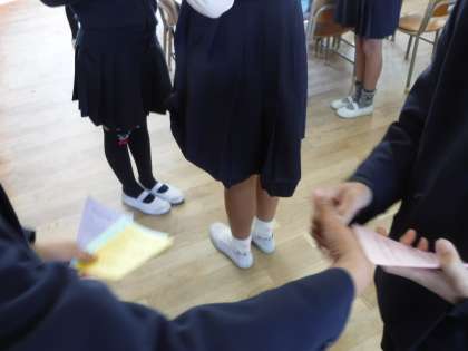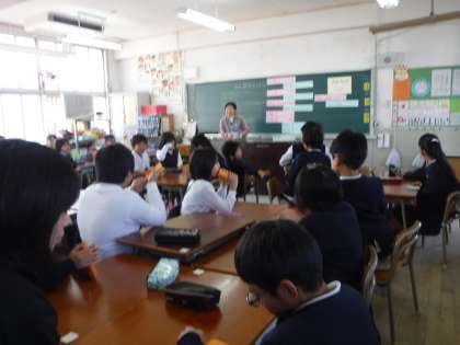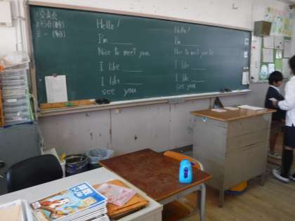 4年生の教室では、外国語の活動をしていました。カードをもって挨拶を交わして、自己紹介をしあっていました。