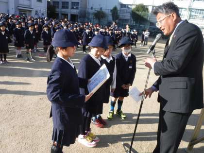 12月7日(月)全校朝会で、先日の土曜日に行われた「東南民族音楽会」に参加した子どもたちへ表彰状を渡しました。