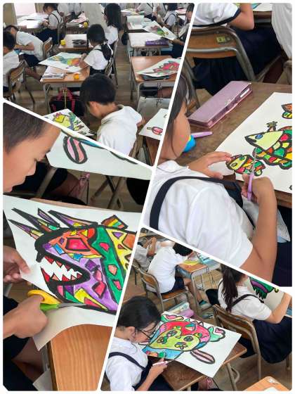 描いたカラフルな魚を線に沿ってはさみで切ります。切り取った魚は、青色の画用紙にのりで貼りました。また、濃さの違う青色の画用紙を用意し、どの背景の色が合うのかを考えました。