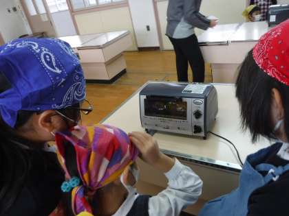 12月10日(木)今日も2年生が家庭科室で自分たちで育て、収穫したおイモを調理して食べる日です。