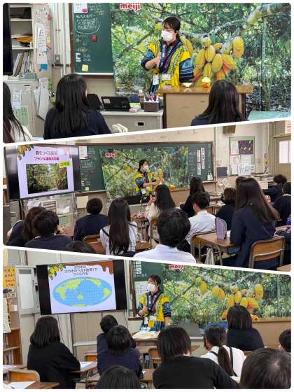 株式会社明治の方が来られて、食育の一環として、「カカオ・チョコレート教室」が行われました。