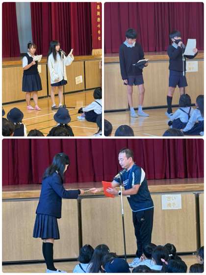 今日の児童朝会では、夏休みの絵画コンクールの受賞者の表彰式や、新聞委員会や給食委員会からのお知らせがありました。