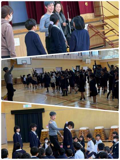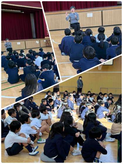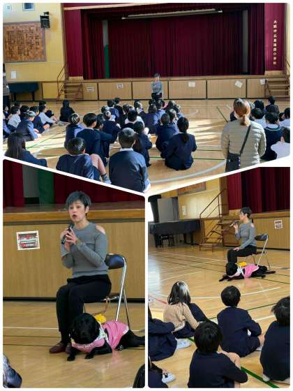 盲導犬の学習を3年生で行いました。浅井純子さんと盲導犬ライズが講師で来られました。