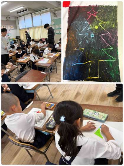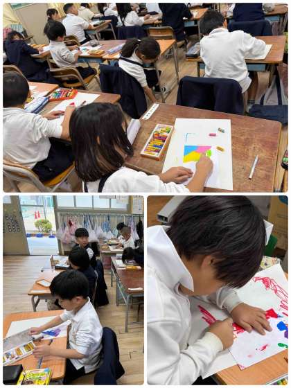 画用紙にクレヨンでたくさんの色を塗り、上から黒を塗ります。