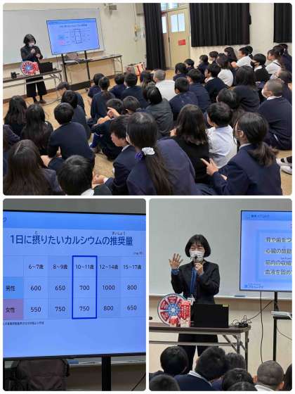最初に「骨の成長に大切なことを考えよう」をテーマに、骨の仕組みやカルシウムの役割について学びました。