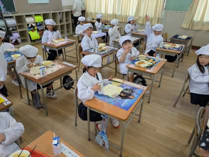 みんなが大好きな給食が始まりました。大きな声で挨拶をして、おいしく給食を食べています。