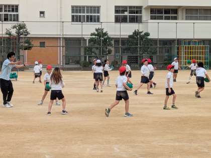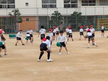 ボールを使っていろいろな動きに挑戦しました。走りながら投げたり、捕ったり。友だちと力を合わせながら楽しく取り組んでいました。