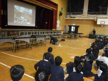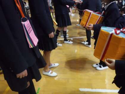 続いて、6年生からのプレゼントです。この日のために、6年生がつくってくれた教室用の台を各学級に渡しました。森山直太郎氏の『さくら』を合奏・合唱もありました。