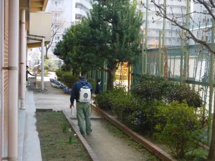 先週の間に、管理作業員さんが校内の校舎周りに除草剤を撒いてくださいました。