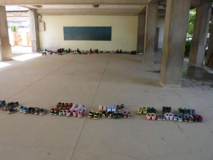 例によってピロティにきれいに靴を並べて講堂で取り組んでいます。