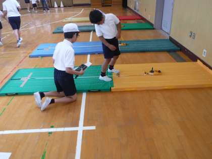 学年でペアを組んで高学年が低学年の記録や測定をサポートしています。