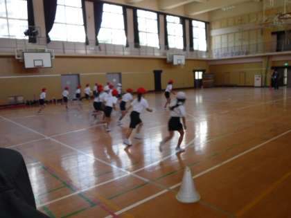 専用の音楽をCDで流しながら、一定の時間内に決められた距離を行ったり来たりして、その回数をカウントしていきます。持久力を測る種目です。