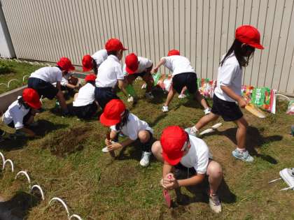 先生のお話をよく聞いて、お友だちに土がかからないようにぶつからないように気をつけながら、一生懸命土を掘り起こしていました。