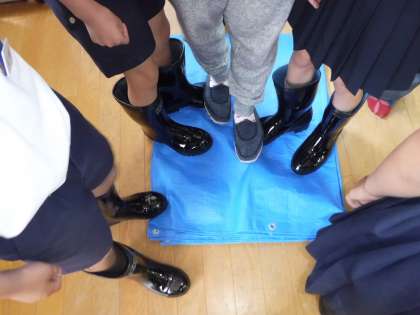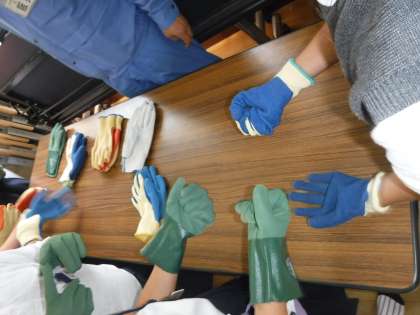 多目的室をのぞいた時は、環境局の方々の仕事着を着せていただいたり、作業をするときに着用する手袋や靴を履かせていただいたりしていました。
