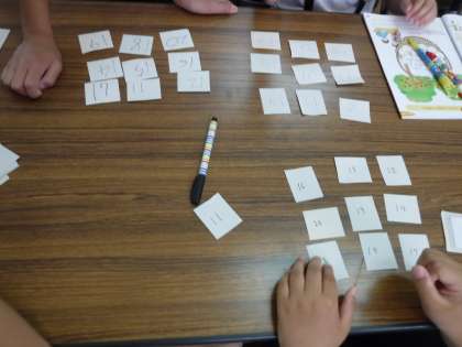 小さなカードに11〜20の数字を書いていき、そのうちの9枚を自分で並べていき、4人ひと組で、じゃんけんをして順番に1枚ずつ数字を選んでいきます。縦・横・斜めに先に並んだ人が勝ちです。