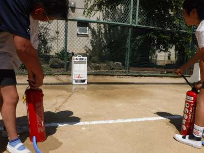 5・6年生は、運動場で水が出る消火器を使って火を消す訓練を一人ずつしました。