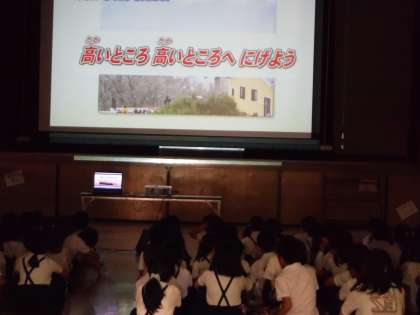 3・4年生は、講堂で同じく津波発生時の避難についてのDVDを観て学習しました。