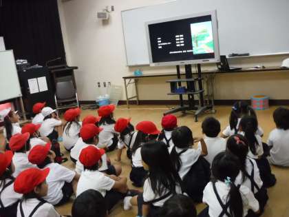 1・2年生は、多目的室で津波が起きたらどうするのかを動物がキャラクターとして登場し、わかりやすく説明してくれるDVDを観て学習しました。