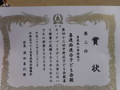 キックベースボール大会で第3位の成績をおさめた子ども会の子どもたちもきっと一生懸命練習を重ね、試合で全力を尽くしたことでしょう。みんなの前で表彰し、賞状は校長室前にしばらく飾っておこうと思います。