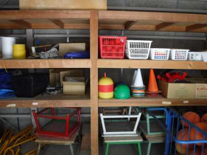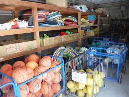 体育倉庫の写真です。こちらも管理作業員さんが棚を2段に分けてくださり、ものが整理しやすくなりました。校長先生が中心となって、使いやすい倉庫、時期に応じて運動するときに道具が取り出しやすい体育倉庫となってきました。