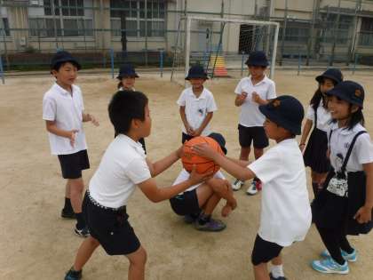たてわり班で円の形に集まって、1つのボールを隣の人にどんどん渡していきます。集会委員会の進行掛が「反対!」と言ったらボールを回す方向を逆回りにします。「ストップ!」と言うまでこれを続けます。この時にボールを持っていた人がアウトです。