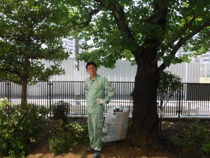 暑い季節に向けて、管理作業員の森さんが校内の植物の剪定をしてくださっています。