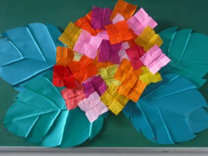2年生の掲示板に、とっても大きな色鮮やかなアジサイが咲いていました。